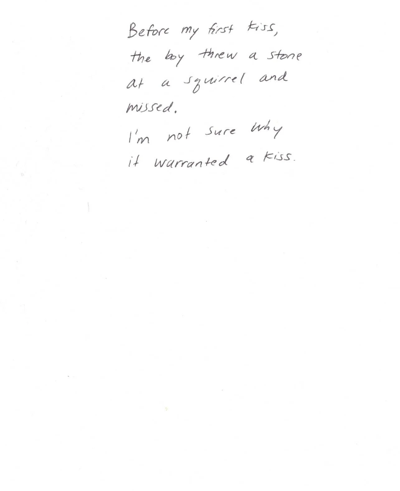Two squirrels were fighting and one ran into my feet, I'm sorry, I kicked him, his soft little squirrel belly condemned to my chest. I felt, the whole day. Can someone tell me the memory of the squirrel? How far can they see? Would squirrel forgive me if I told him that when I tried to move out of the way, squirrel pivoted too fast. It was not my fault. Do squirrels pray? Do they have mercy? Guilt is a privilege. In the spring, the trees bloom and the squirrel homes blow away. When I was a kid, my Mom used to clear trails in the pine needles for me to play. The squirrels would watch from the edge as I moved fast, kicking up dirt, until all the paths were gone.